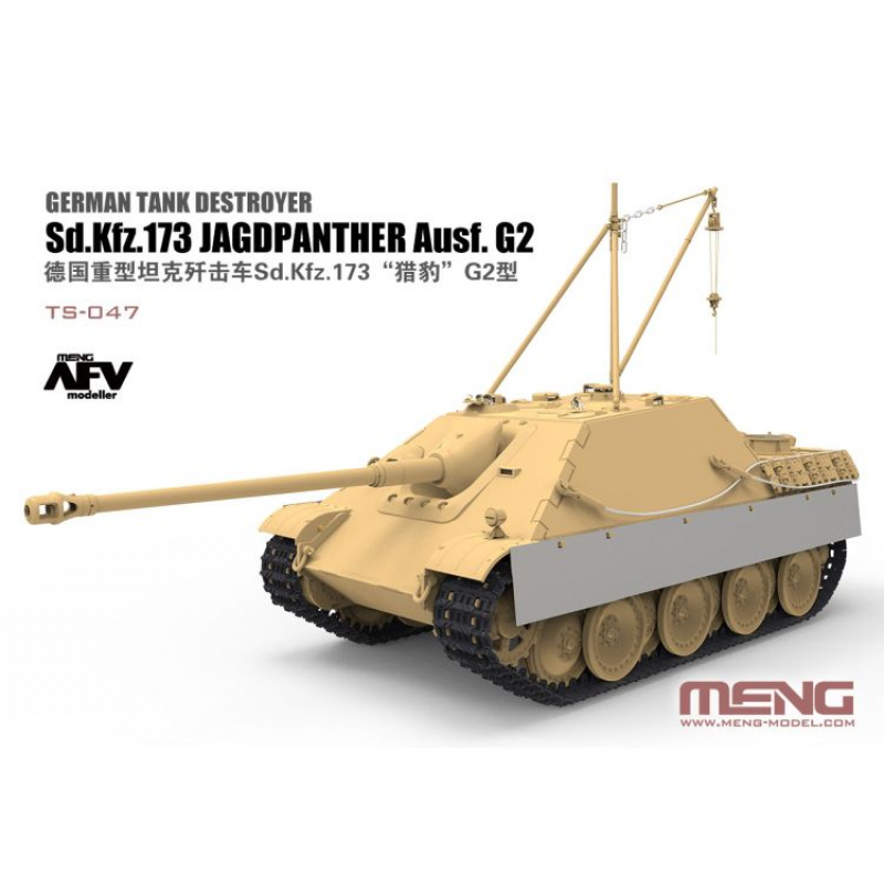This TS-047 German Tank Destroyer Sd.Kfz.173 Jagdpanther Ausf. G2 model kit is the latest MENG Panther series product. The finished model will be 289.7mm long and 97mm wide. This kit includes a jib crane for lifting heavy things and the engine, Fine PE parts, metal cables and PE side skirts. Surface details incl. weld beads, cast texture, cutting marks and hot rolling texture are outstandingly reproduced. The suspension system can be upgraded with the SPS-049 German Medium Tank Sd.Kfz.171 Panther Late Production Tracks & Movable Running Gear Parts (sold separately).