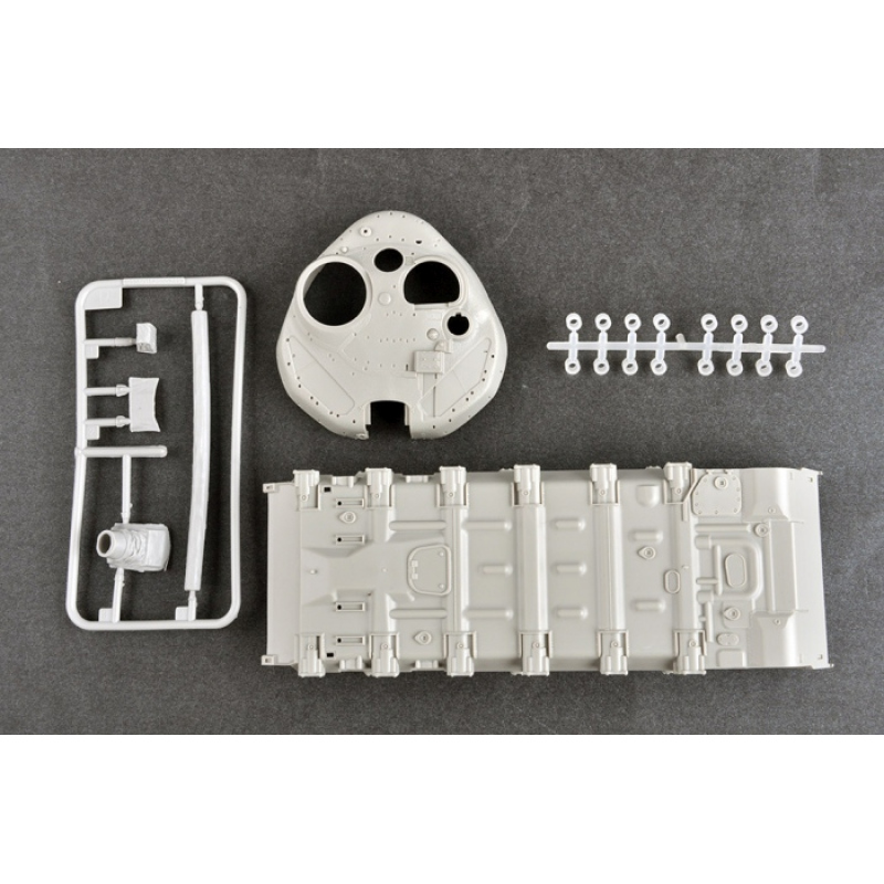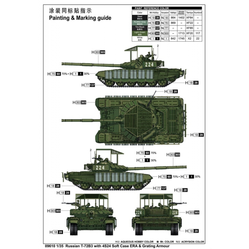 Plastik-Modellbausatz für ein Panzer-Modell des russischen Kampfpanzer T-72B3 mit 4S24 Soft Case ERA- & Gitterpanzerung